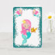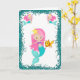 Eine sehr süße Geburtstagskarte aus Meerjungfrau mit einer niedlichen Meerjungfrau mit rosa Haaren, die ihren Lieblingsgoldfisch klopfen, umgeben von einem Rahmen aus aquamarinem Glitzer (Sand zu emulieren). Im Inneren befindet sich ein weiteres Meerjungfrau-Bild und der traditionelle Geburtstagsgruß (Happy Birthday), der auf den Anzug angepasst werden kann.