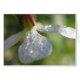 Schöne Blindkarte mit Makrofoto einer winzigen weißen Blume, die mit kleinen Tau-Tropfen bedeckt ist.
