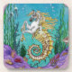Originelle Aquarellmalerei von Sandra Gale eines fantasievollen goldenen Meeresseilross, das über einem tropischen Riff im Meer schwebt. Ein tolles Bild für Kinder, Jugendliche und alle, die Meerpferde und Ozean Lieben. Auch das Badezimmer ist sehr schön gestaltet!