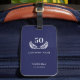 Dieses Gepäckanhänger ist eine lustige und einfache Möglichkeit, Ihre Taschen zu personalisieren. Dekorieren Sie es mit Ihrem Firmennamen, Jahr und Anzahl der Jahre im Betrieb. Der klassische, weiße Lorbeerkranz verleiht jeder Tasche, die Sie unterwegs mitnehmen, eine elegante Touch. Navy blauer Hintergrund, weißer Text.