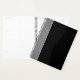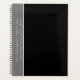 Schwarz-Grau-Lehrplaner mit Text auf der Seite. Spiral gebunden, mit einem Platz für ein oder zwei Textzeilen wie den Namen, die Klasse und das Jahr des Lehrers. Minimalistisches, männliches Design, für einen männlichen Lehrer, mit weißer, schwarzer Vorderseite und dunkelgrauer Grenze mit hellgrauem, bedrucktem Text. Das Gegenteil ist massiv schwarz.