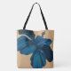 Marineblau colorway. Schön werden die illustrierten Hibiskus-Blumen, die von einem hawaiischen Garten frisch sind, auf einer Imitatleinenbeschaffenheit gedruckt, um diesen Vintagen schauenden tropischen Kissenentwurf abzuschließen. Die Strandtasche hat eine andere Blume auf der Front und der Rückseite. Diese Entwürfe kommen in einige colorways.