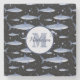 Der Hai- und Monogramm-Untersetzer von Nautical Boutique Co. zeichnet sich durch einen Aquarellhai und Quallen in Stahlblau auf schwarzem Hintergrund aus. Das Aquarellmonogramm ist eine traditionelle nautische Schablonentypografie mit einem Aquarelleffekt, mit dem Namen in Schrifttyp. Sie sind von einem marineblauen Seil umgeben. #Shark #Monogram ・