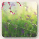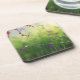 Ein silbernes Spinnennetz, das mit glitzerndem Tau bedeckt ist, lässt die Glitzer in der warmen Sonne eines frisch grünen Frühlingsmorgens fallen. Die winzigen rosa Blüten eines Baumes hängen hinter dem Netz, was sich in den Tröpfchen widerspiegelt.
