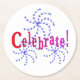 Feuerwerke bieten einen "Feiern!"-Gruß. Pinräder von hellblauen Sternen umgeben den Text in Farbverlaufsfarben von Rot bis Rosa (in schwarz dargestellt).