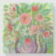 Ein spielerisches Bild von rosa und roten Blume in einer lila Vase.