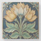Die im Jugendstil inspirierte Kachel mit gelb-weißem Lotus-Relief-Blume mit grünen Blätter auf dunkelblauem Hintergrund weist einen dekorativen Rahmen mit Blumenmotiven auf.