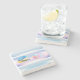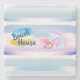 Der Untersetzer aus Stein in Blau und Rosa Beach House ist mit Sandbuckel und Beachball gestaltet.
