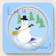 Schneemann mit Schaufel ist bereit, den Schnee aus seiner Schneedecke zu reinigen. Grüne Kiefernbäume stehen hinter ihm. Text "Lass es ... Schnee" kann Personalisiert sein. Die Hintergrundfarbe kann individuell angepasst werden.