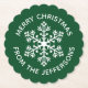 Eine weiße Schneeflocke auf einem festlichen Waldgrün-Hintergrund mit "Frohen Weihnachten" aus der Familie in einem Kreis darum herum.
