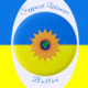 Unterstützung für die Ukraine-Taste. Die ukrainische Flagge, mit einer schönen Sonnenblume zentriert auf den hellen Blöcken von gelb und blau. Die Sonnenblume ist ein dunkelgoldenes Gelb mit einem Erdzentrum.