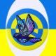 Unterstützung für die Ukraine-Taste. Die ukrainische Fahne Farben, mit einem Friedenssymbol und Taube geschichtet. Die Taube ist voll von lebendiger Blues, lila und pinks, die Pop gegen die hellen Blöcke von gelb und blau.