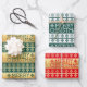 Ein Trio aus Geschenkpackungen, jedes mit einem anderen Design, ist ideal für Ihre Weihnachtsgeschenke. Alle drei Blätter haben ein hässliches Schneeflockenmuster auf ihnen, das den festlichen Weihnachtsgrüß "Frohe Weihnachten" auf sich trägt. Das erste ist das Imitat Gold auf Waldgrün. das zweite Waldgrün auf Weiß und das dritte Imitat Gold auf Rot.