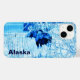Ein blaues und weißes Bild einer Kuh Elche in urbaner Umgebung im Winter. Auch "Alaska" erscheint als anpassbarer Text. Elche sind das ganze Jahr über Einwohner in vielen Alaskan Gemeinden. Hier in Anchorage gibt es ca. 1500 Tiere, zusammen mit Wölfen, Braunbären und anderen Wildtieren. Sie sind meist gut benommen. Sie überqueren oft die Straßen an der Kreuzung, nachdem sie für ein Spaziersignal gewartet haben. Aus einem Foto eines Elchs, der durch meinen Hof wanderte.