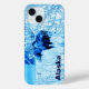 Ein blaues und weißes Bild einer Kuh Elche in urbaner Umgebung im Winter. Auch "Alaska" erscheint als anpassbarer Text. Elche sind das ganze Jahr über Einwohner in vielen Alaskan Gemeinden. Hier in Anchorage gibt es ca. 1500 Tiere, zusammen mit Wölfen, Braunbären und anderen Wildtieren. Sie sind meist gut benommen. Sie überqueren oft die Straßen an der Kreuzung, nachdem sie für ein Spaziersignal gewartet haben. Aus einem Foto eines Elchs, der durch meinen Hof wanderte.