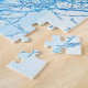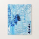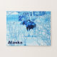 Ein blaues und weißes Bild einer Kuh Elche in urbaner Umgebung im Winter. Es erscheint auch das Textlesen "Alaska". Elche sind das ganze Jahr über Einwohner in vielen Alaskan Gemeinden. Hier in Anchorage gibt es ca. 1500 Tiere, zusammen mit Wölfen, Braunbären und anderen Wildtieren. Sie sind meist gut benommen. Sie überqueren oft die Straßen an der Kreuzung, nachdem sie für ein Spaziersignal gewartet haben. Aus einem Foto eines Elchs, der durch meinen Hof wanderte.