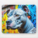 Farbenfrohe digitale Ai-Kunstausstellung umgeben von Graffiti-Straßenkunst in einer städtischen Umgebung.