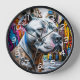 Farbenfrohe digitale Ai-Kunstausstellung umgeben von Graffiti-Straßenkunst in einer städtischen Umgebung.