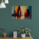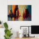 This dynamic abstract artwork captures the energy and rhythm of a modern city through towering vertical forms and bold architectural silhouettes. Warm tones of amber, rust, and deep red rise alongside cool blues and charcoal grays, creating a powerful contrast that evokes skyscrapers bathed in shifting light. Dripping paint and textured brushstrokes add a sense of motion, as if the city itself is breathing, pulsing, and constantly evolving.