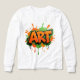 A bold graffiti-style typography artwork bursting with urban energy. The word “ART” explodes from a deep black background in vibrant orange, outlined with neon green accents. Paint splashes and dripping effects add movement and raw street-art attitude, symbolizing creativity without limits. The contrast of sharp lettering and fluid splatters reflects the fearless, expressive nature of modern art culture.