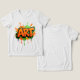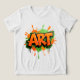 A bold graffiti-style typography artwork bursting with urban energy. The word “ART” explodes from a deep black background in vibrant orange, outlined with neon green accents. Paint splashes and dripping effects add movement and raw street-art attitude, symbolizing creativity without limits. The contrast of sharp lettering and fluid splatters reflects the fearless, expressive nature of modern art culture.