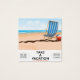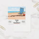 Nehmen Sie einen Urlaub "Sein schneller mit der Bahn" Vintages Strandurlaub-Poster eines Vintag gestreiften Liegestuhls und Beachball auf einem heißen Sandstrand am Ozean.