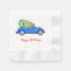 In Weiß gehaltene Servietten aus Urlaubspapier mit einem festlichen Weihnachtswagen und Baumdruck. Ideal für alle Ihre Feierlichkeiten. Passen Sie dieses Element an und fügen Sie Namen hinzu oder kaufen Sie, wie es ist.