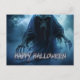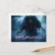 Ein düsterer, schwebender schwarzer Geist mit ätherischer Form, umgeben von dichten Nebelwolken, der bedrohlich über dem Boden in einer dunklen, hellischen Landschaft mit einer unheimlichen Atmosphäre schwebt. Happy Halloween