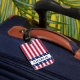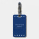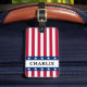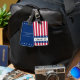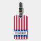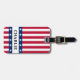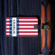 Gepäckmarke mit roten und weißen Streifen und Ihrem individuelle Name zwischen den blauen Sternen.