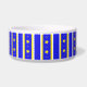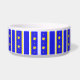 Weiße Keramikhundenahrung/Wasserschüssel, mit Blau, Weiß und Gelbstreifenmuster, mit Reihen der gelben Sterne. Ein großer Schwarzweiss-Cartoonknochen-Textbereich, auf der Front der Schüssel, hat den blauen kundenspezifischen Text, der bereit ist, mit dem Ihrem Namen des Haustieres zu personifizieren. Reizende Geschenkidee für irgendeinen Hundebesitzer.