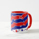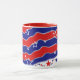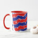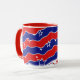Ein roter und blauer patriotischer Entwurf mit gewellten Linien und Sternen. Personifizieren Sie mit Monogramm im roten Skript.
