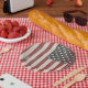 Richten Sie oben auf diesen roten, weißen und blauen Sternen u. Streifen-Vintagen AmericanapapierTeller an.