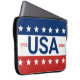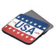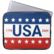 Celebrating the USA's 250th anniversary. This red, white, and blue laptop sleeve has the word 'USA' in the center. The years 1776 and 2026 are next to USA. The top stripe is blue and has white stars. The center stripe is white. The bottom stripe is red with white stars.