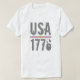 USA und 1776 in einem einzigartigen Schriftart ist grau auf diesem unisex T - Shirt mit roten und blauen Streifen und einem goldenen Stern hervorgehoben. Wählen Sie Ihre T - Shirt Farbe und Größe aus den verfügbaren.