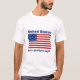 Ein editable Titel und ein Slogan begleitet die roten und weißen Streifen mit weißen Sternen auf blauem Bezirk der amerikanischen Flagge auf der Front dieses T - Shirt. Die Rückseite zeigt eine ausführliche Karte von USA an.