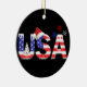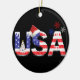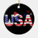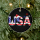 "USA" in den US Flagge mit Kreuzen und Kristall, einem Weihnachtsbaum und einer Weihnachtsmannmütze auf "USA", und Schneeflocken in Rot, Weiß und Blau im Hintergrund. Einzigartiges Design in den USA für die Urlaubssaison.