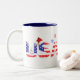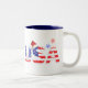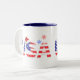 "USA" in den US Flagge mit Kreuzen und Kristall, einem Weihnachtsbaum und einer Weihnachtsmannmütze auf "USA", und Schneeflocken in Rot, Weiß und Blau im Hintergrund. Einzigartiges Design in den USA für die Urlaubssaison.