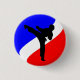 Ein Kampfkunstmann auf einem roten weißen und blauen Hintergrund. Für die Kriegskünste, die Button handeln, zeigen Sie Ideen, Besuch MartialArtsPartyStore an.