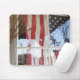 USA, Oregon, Shaniko. Flagge im Fenster nahe bei Mousepad