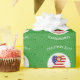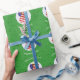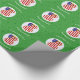 Design auf Geschenkpapier hat einen roten Haarengel, der die Fahne der USA trägt. Oben, die Worte, in weißen Buchstaben, lesen, CHRISTMAS 20?? Unten, ein Ort für einen Namen, Ihren, für ein personalisiertes Aussehen, oder, Ihre Geschenkempfängerin für eine durchdachte, maßgeschneiderte Geschenkpackung. Der Engel sitzt auf einem weißen Kreis, der ein Fraktal ist. Alles liegt auf einem Fraktal mit grünen quadratischen Quadraten.