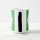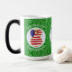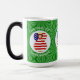 Die magische Morphing-Tasse ist mit einem in der Fahne der USA gekleideten USA-Engel in einem weißen, Fraktal-Kreis von quadratischen Quadraten versehen. Der Kreis befindet sich auf einem grünen Fraktal mit quadratischen Quadraten. Fügen Sie einen Namen, Ferien und Jahr hinzu, um Ihre Tasse als Geschenk zu personalisieren oder Ihre Feriendekoration zu ergänzen. Schöne Weihnachtsdekoration. Design zeigt auf drei Seiten der Tasse.