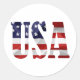 USA-Text und die Flag der USA, eingebettet in jedem Buchstaben. Klassischer Rundaufkleber. Sie können aus dem Menü eine andere Form des Aufklebers auswählen.