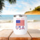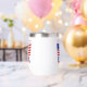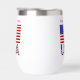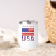 Personalisierter Thermalweintumbler mit Briefen, die die USA unter der amerikanischen Flagge lesen. Fügen Sie einen Namen hinzu, um das Aussehen zu personalisieren, oder erstellen Sie ein Geschenk für den Unabhängigkeitstag. Die Flagge der Vereinigten Staaten ist rot, weiß und blau mit US Flagge. Sehr schön für Wiedersehen, Reisegruppen und Clubs. Spaß Geschenk für jede Gelegenheit oder Veranstaltung. Schönes Geschenk für die Hauswärmung. Design zeigt auf zwei Seiten.