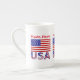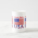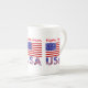 Personalisierte Knochen-China Tasse zeigt die Fahne der USA mit den Buchstaben USA unten in den rot, weiß und blau mit US Flagge, in der Fahne gefunden. Personalisieren Sie diese durch Hinzufügen von Namen, in roten Buchstaben, für sich selbst oder ein kreatives Geschenk. Ideal für patriotische Feiertage wie den Unabhängigkeitstag. Liebliches Muttertagsgeschenk. Erstaunlich für den Einsatz in Wiedersehen, Vereinen und Reisegruppen. Es ist auch ein nettes Geschenk für Patrioten.