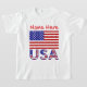Personalisierter T - Shirt eines Mädchens mit der Fahne der USA, oder, amerikanische Flagge mit den Buchstaben USA unten in rot, weiß und blau mit US Flagge, in der Fahne gefunden. Personalisieren Sie, indem Sie den Namen Ihres Mädchens für ein kreatives Geschenk hinzufügen. Design zeigt auf Vorder- und Rückseite des Shirts. Sie wird Liebe tragen, um Wiedersehen und Unabhängigkeitstag Feiern.