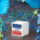 Celebrating the USA's 250th anniversary. This red, white, and blue favor box has the word 'USA' in the center. The years 1776 and 2026 are next to USA. The top stripe is blue and has white stars. The center stripe is white. The bottom stripe is red with white stars.