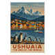 Retro Vintage Reiseplakat von Ushuaia, Argentinien, die südlichste Stadt der Welt. Vorbei: farbenfrohe Häuser am Meer mit kleinen Booten, die im Hafen verankert sind.
