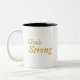 Die "Utah Strong" Two-Tone-Coffee-Tasse verkörpert zeitgenössische Design-Trend und feiert gleichzeitig die Widerstandsfähigkeit und den Geist von Utah. Diese Tasse, die mit einem scharfen Blick für moderne Ästhetik gestaltet wurde, verbindet die minimalistische Eleganz nahtlos mit einer wirkungsvollen Botschaft. An der Vorderseite der Tasse wird die kühne, stilvolle Typografie gezeigt, die "Utah Strong" in goldenen Buchstaben ausdrückt. Der Einsatz von Goldakzenten verleiht der Tasse eine Touch von Luxus und Prestige, was die visuelle Anziehungskraft erhöht und eine kraftvolle Aussage macht. Die Wahl des Schriftartes spiegelt moderne Designsensibilitäten wider, mit schlanken Sans-Serif-Figuren, die ein Gefühl von Stärke und Widerstandskraft vermitteln.
