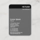 Eine vertikale Visitenkartenvorlage mit einem schwarzen Header und einem Bild auf der Vorderseite. Firmenname im Kopf vorne und hinten mit allen anderen Kontaktdaten auf der Rückseite. Das Foto oder Bild auf der Vorderseite kann ebenfalls geändert werden. Das Design bietet auch viel Raum für zusätzliche Anpassungen.