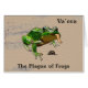 Eine etwas humorvolle Abbildung für Toraabschnitt Va'era, in dem die ersten beiden Seuchen auftreten - Nilwasser wird in Wasser verwandelt, nach dem Ägypten überrannte Frösche ist. Das Bild eines Frosches mit den menschlichen Beinen, die aus seinem Mund herabhängen, und die blau und goldgelb gestreifte Kopfhaut, die Paroh (Pharaoh) allgemein als tragen dargestellt und auf dem Boden entsorgt wird. Das Bild ist auf einem Hintergrund überlagert, der der Wand der Wüstenruinen ähnelt. Die ägyptische Göttin der Fruchtbarkeit und der Geburt Heket wurde als Frosch oder eine Frau mit dem Kopf eines Frosches dargestellt. An den Tempelmauern war sie typischerweise in anthropomorphischer Form, während auf Amulette Heket normalerweise in Tierform war. Der Frosch war ein geeignetes Symbol für Fruchtbarkeit, da Frösche und Kröten im Nildelta sehr häufig vorkommen. Als Pestfrösche könnte man daher als Vorahnung für die spätere Zerstörung ägyptischer Erstgeborener sehen.